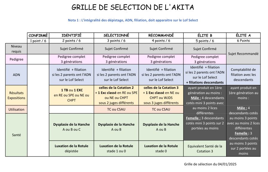 Ci-dessous, vous trouverez la correspondance de chaque cotation et la grille spécifique à l’Akita :